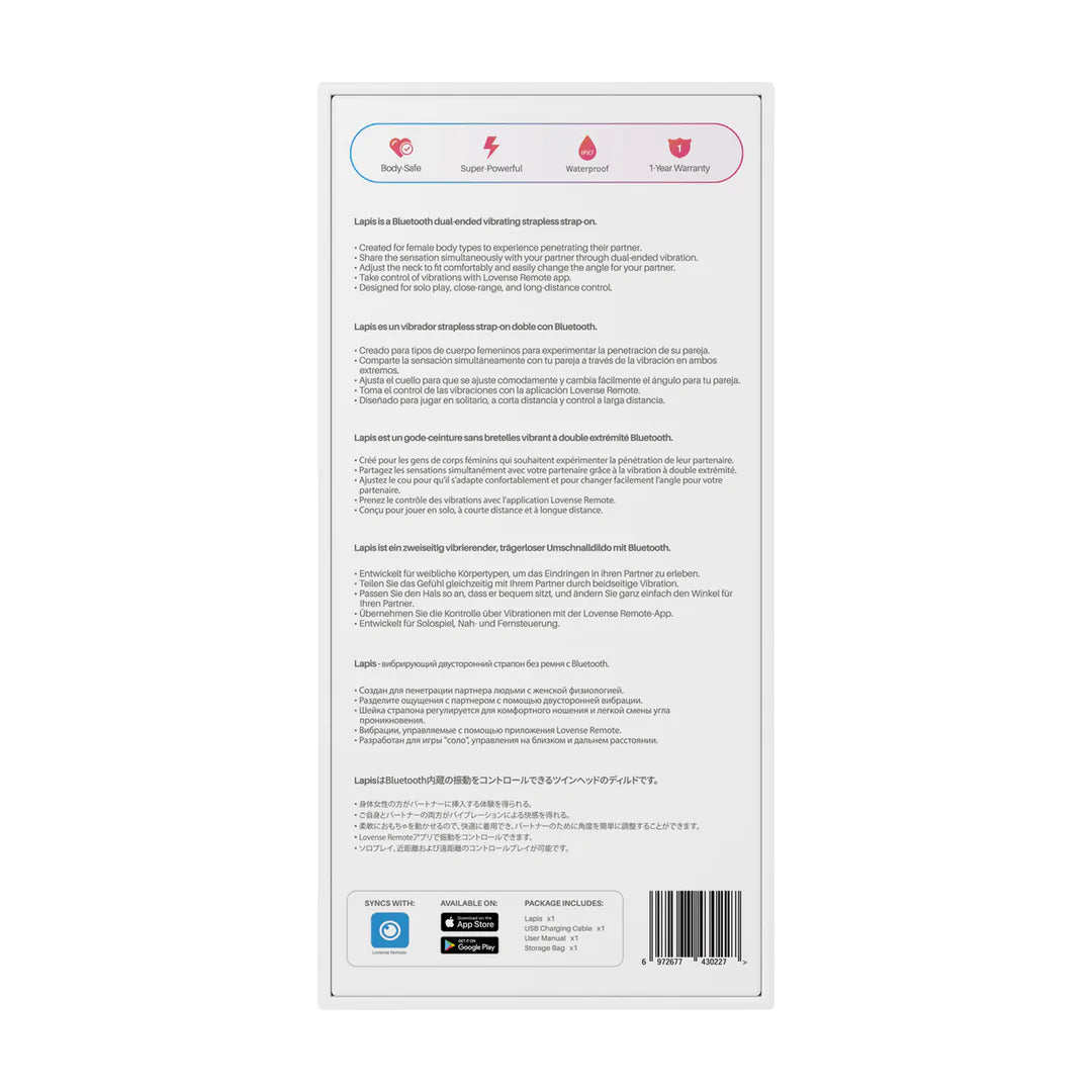 Découvrez Lapis, le vibromasseur sans harnais révolutionnaire conçu pour le plaisir partagé. Ce double gode innovant stimule simultanément le point G et les zones sensibles de chacun, offrant une satisfaction intense et synchronisée. Équipé de trois vibromasseurs indépendants contrôlables séparément ou ensemble, il s'adapte à tous les corps grâce à son col flexible. Stockez jusqu'à 10 motifs vibratoires personnalisés et pilotez-le à distance via l'appli Lovense Remote pour des moments complices, même à distance. Étanche IPX7, il se nettoie facilement et se glisse discrètement dans votre vie intime.